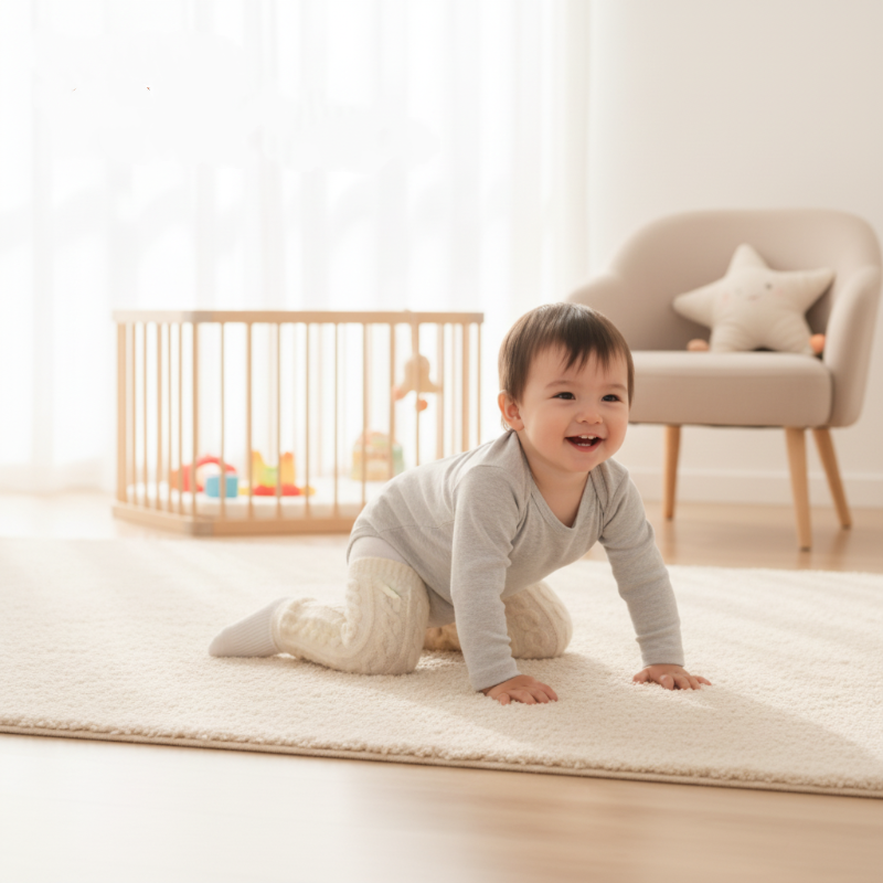 VASTAGÍTOTT PLÜSS ANYAG – Melegen tartja a baba lábait és térdét a hűvös ősszel és télen, nélkülözhetetlen védelmet nyújtva a hideg ellen, akár bent mászkál, akár kint játszik.