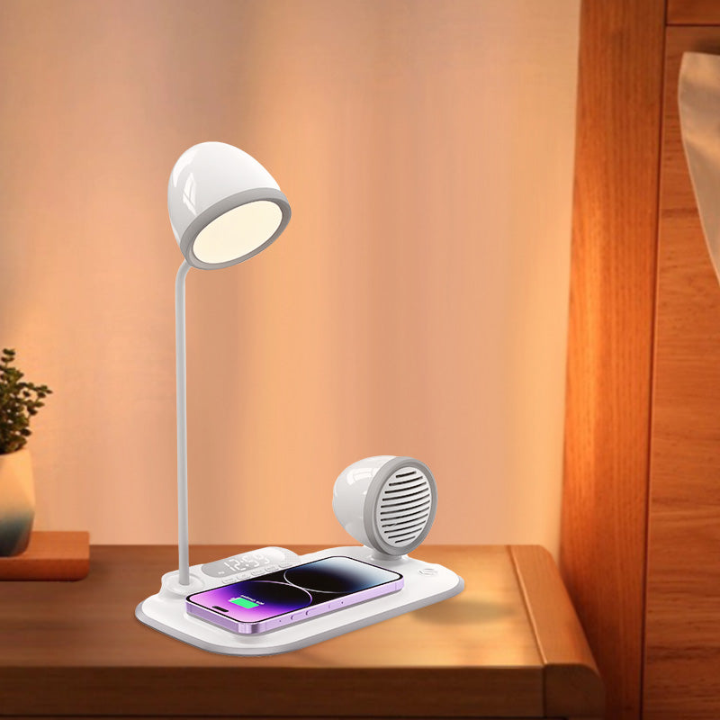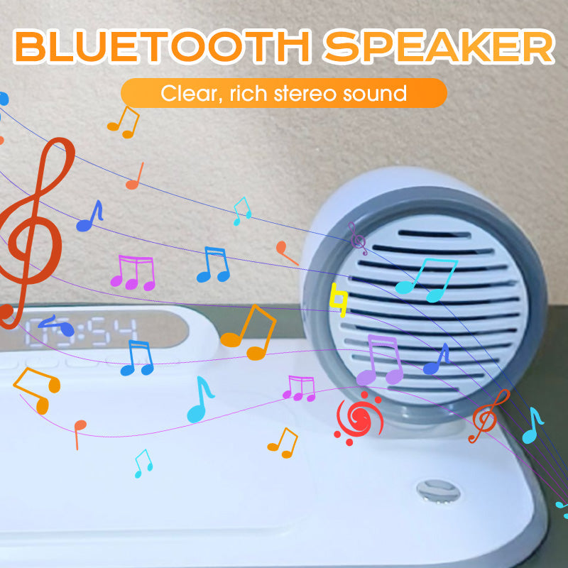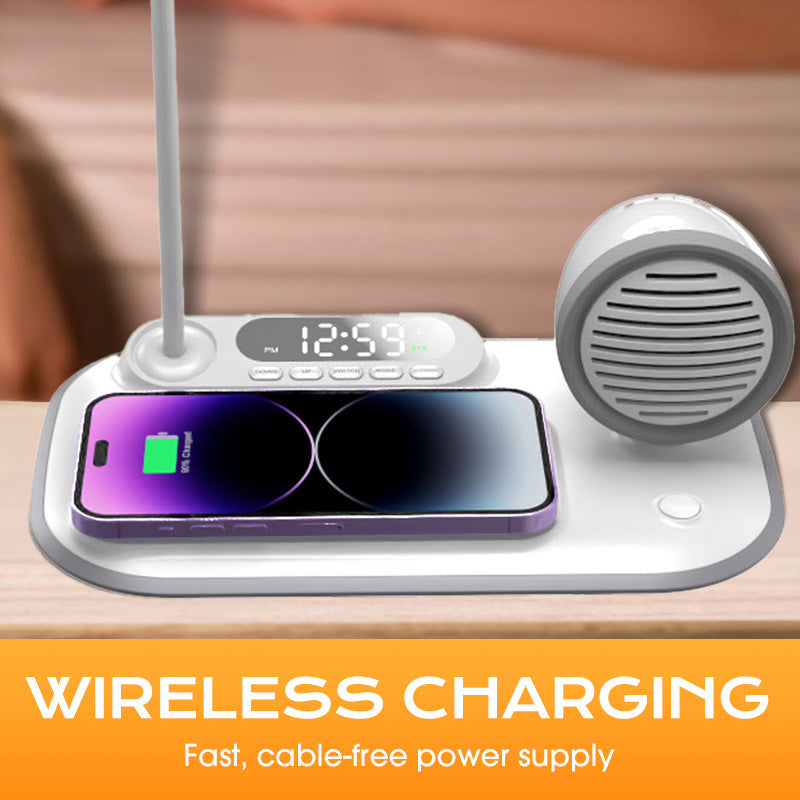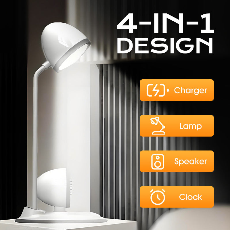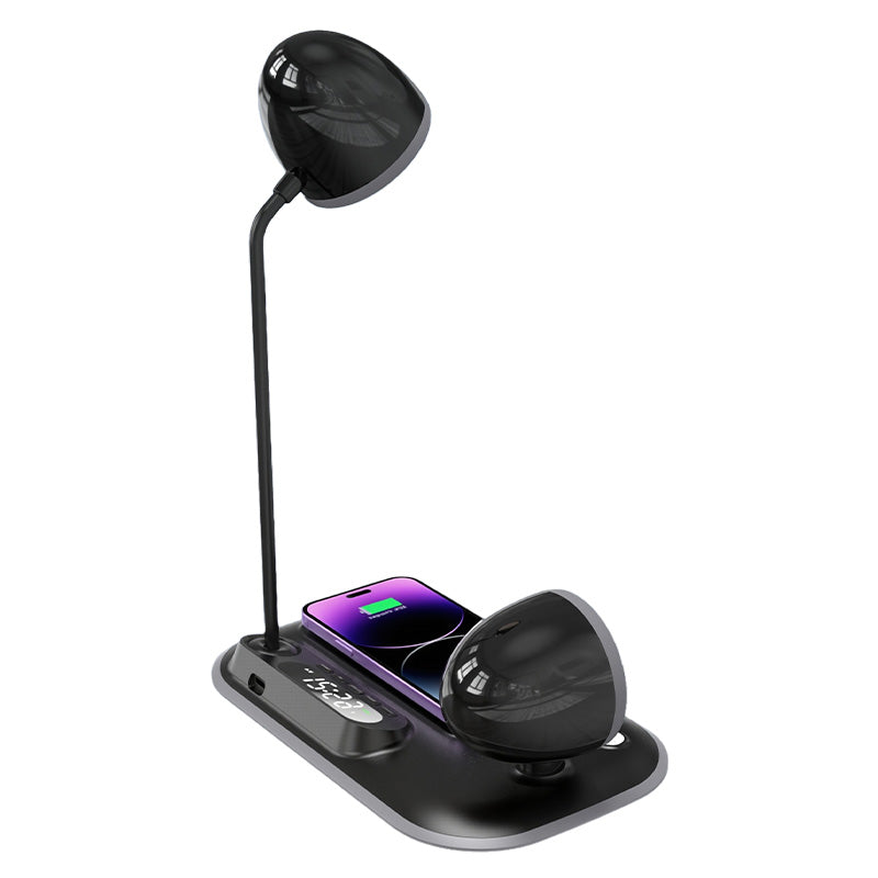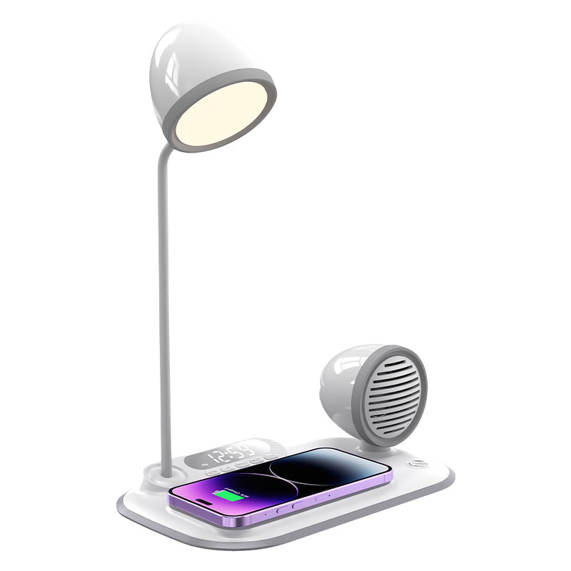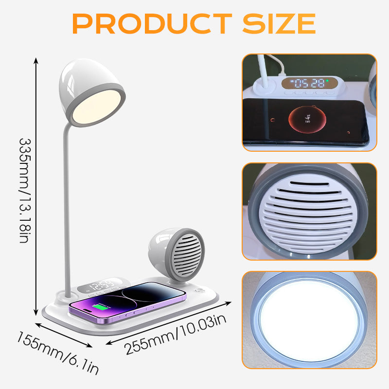 MULTIFUNKCIONĂLIS 4 AZ 1-BEN DESIGN: VezetĂ©k nĂ©lkĂŒli töltĆt, LED asztali lĂĄmpĂĄt, Bluetooth hangszĂłrĂłt Ă©s digitĂĄlis ĂłrĂĄt egyesĂt egy kompakt eszközben. IdeĂĄlis Ă©jjeli szekrĂ©nyhez, irodĂĄhoz vagy tanulĂĄshoz, helyet spĂłrol, miközben modern kĂ©nyelmet ad a mindennapi rutinodhoz.