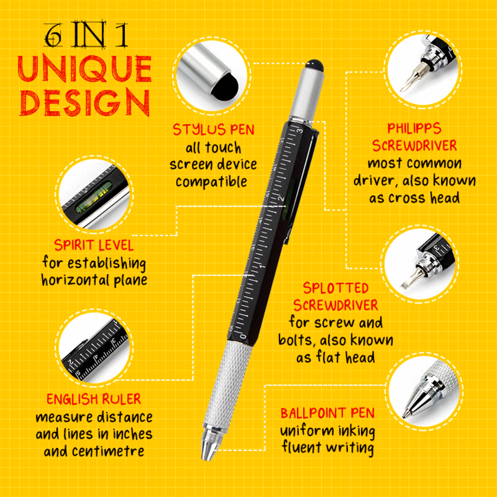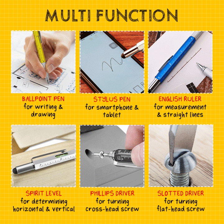 Egyenletes tintĂĄval ellĂĄtott golyĂłstollal; minden eszközzel kompatibilis Ă©rintĆceruzĂĄval; pontos mĂ©rĂ©ssel rendelkezĆ vonalzĂłval; megbĂzhatĂł pĂĄrhuzamos Ă©s merĆleges leolvasĂĄssal rendelkezĆ vĂzmĂ©rtĂ©kkel; Ă©s 2 tĂpusĂș csavarhĂșzĂłval, hatĂ©kony Ă©s kĂ©nyelmes hasznĂĄlattal. 6 az 1-ben multifunkciĂłs Tech Tool Tool toll, tökĂ©letes a mindennapi hasznĂĄlatra.